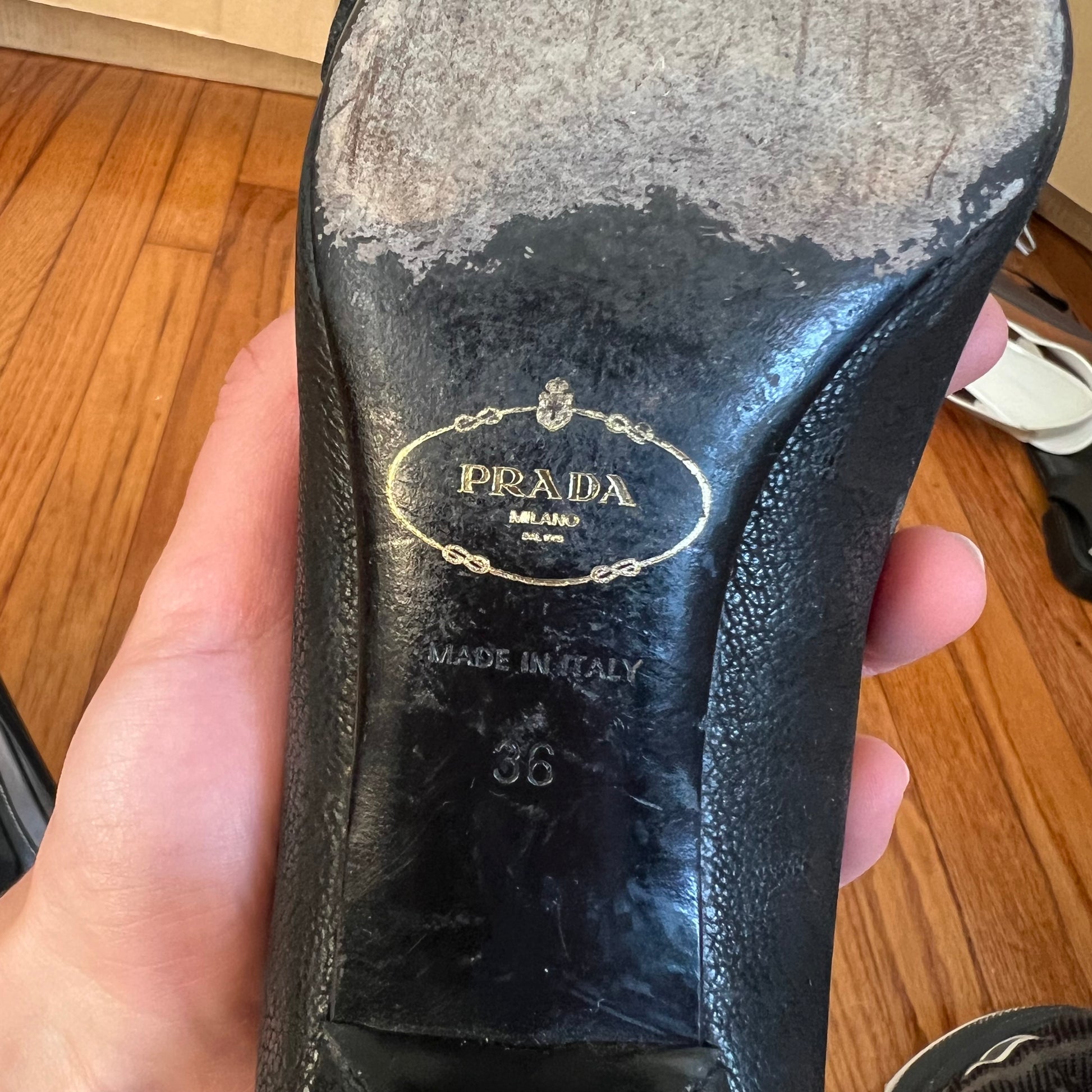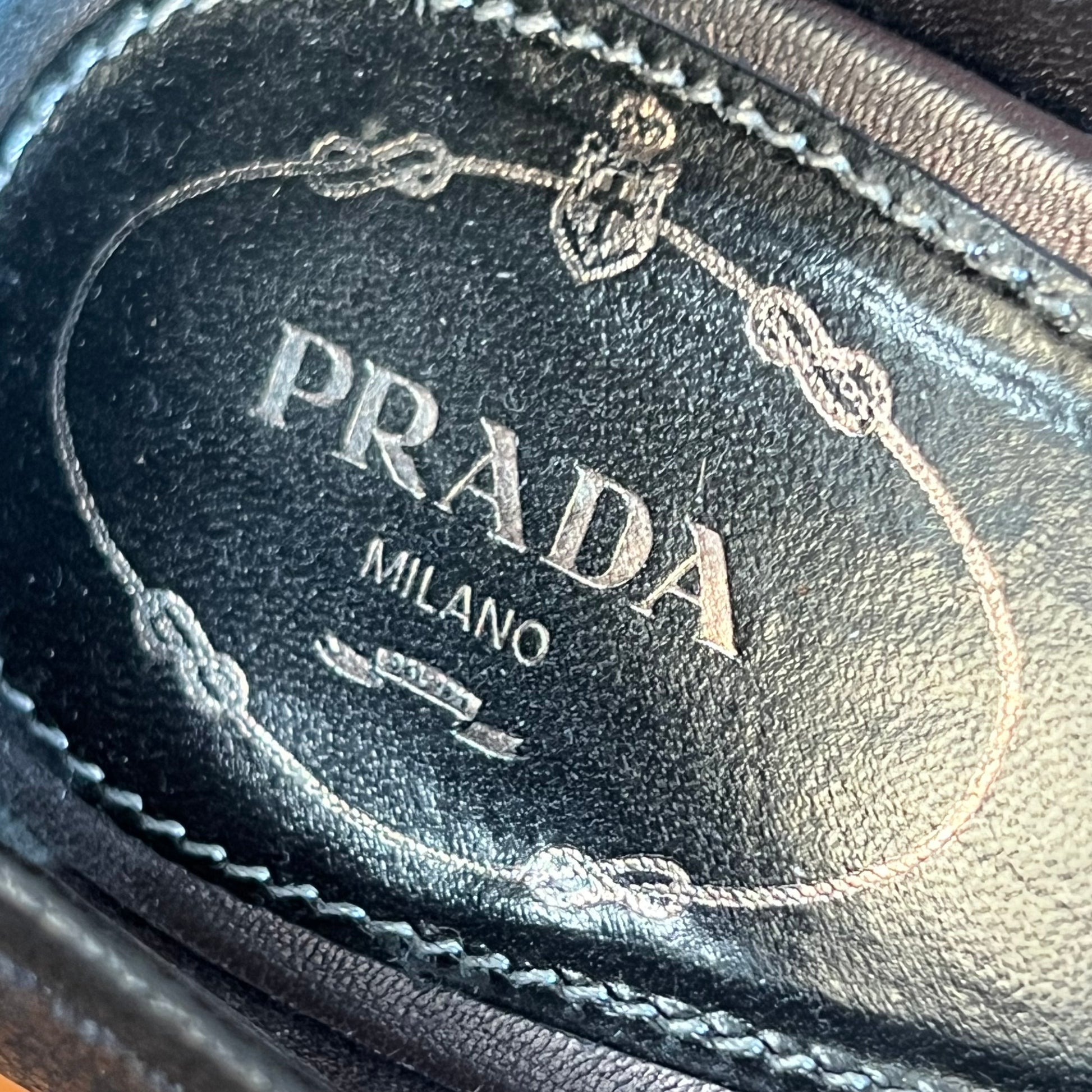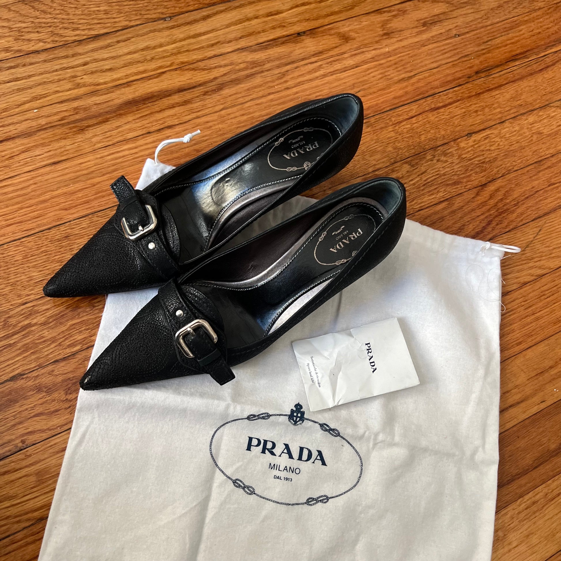 Vintage Prada black leather pointed toe embroidered kitten heel with buckle detail.
